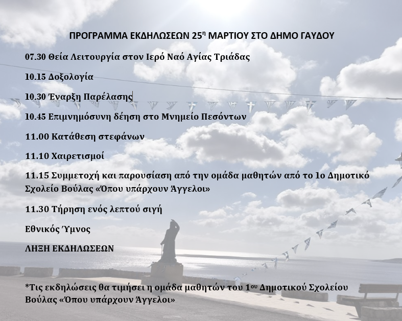 Ο Δήμος Γαύδου με ιδιαίτερη χαρά ανακοινώνει τη φιλοξενία της εμβληματικής πρωτοβουλίας «Όπου Υπάρχουν Άγγελοι», η οποία επέλεξε το νησί μας για τη φετινή αποστολή της, με αφορμή τον εορτασμό της Εθνικής Επετείου της 25ης Μαρτίου.
